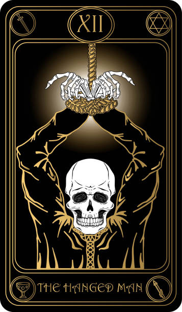Wisielec. Dwunasta karta czarnych i złotych kart tarota Wielkich Arkanów. Ręcznie rysowana ilustracja wektorowa z czaszkami, symbolami okultystycznymi, mistycznymi i ezoterycznymi.