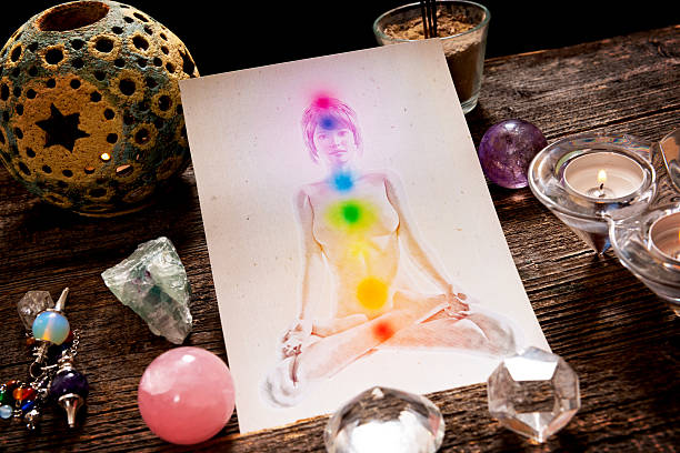 Czakry przedstawione na ludzkim ciele za pomocą naturalnych kryształów i wahadła